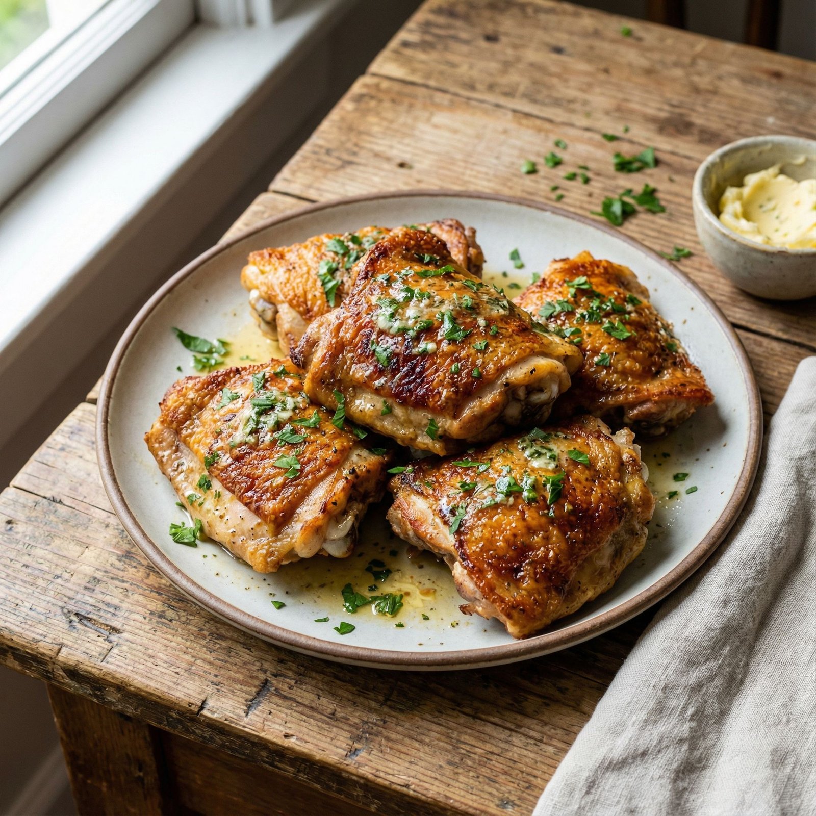 Air Fryer Crispy Chicken Thighs with Garlic Herb Butter
